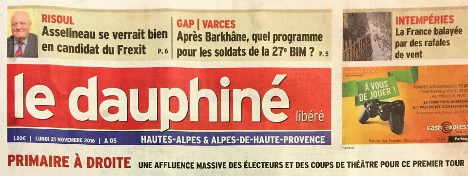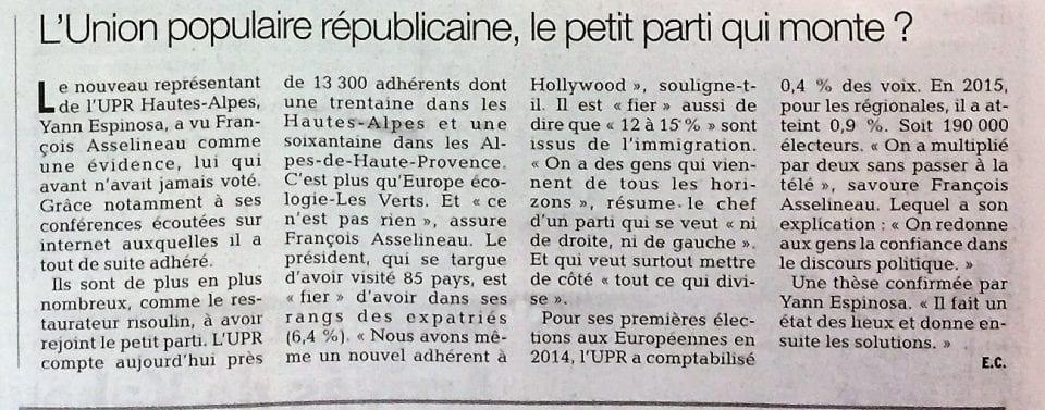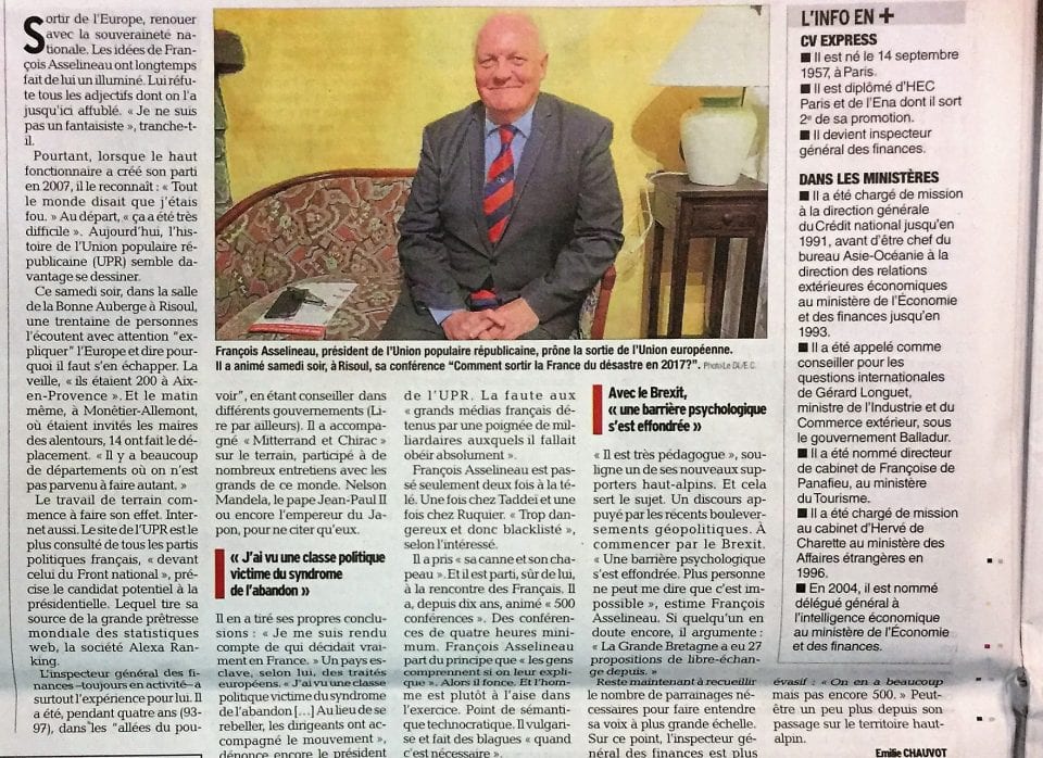 À l’occasion des réunions publiques que François Asselineau a tenues à Risoul (Hautes-Alpes) le 19 novembre et à Manosque (Alpes de Haute-Provence) le 20 novembre, l’édition du 21 novembre du Dauphiné libéré consacre un long article à l’UPR et à sa candidature à l’élection présidentielle.