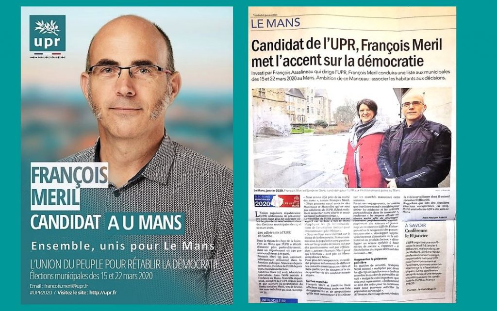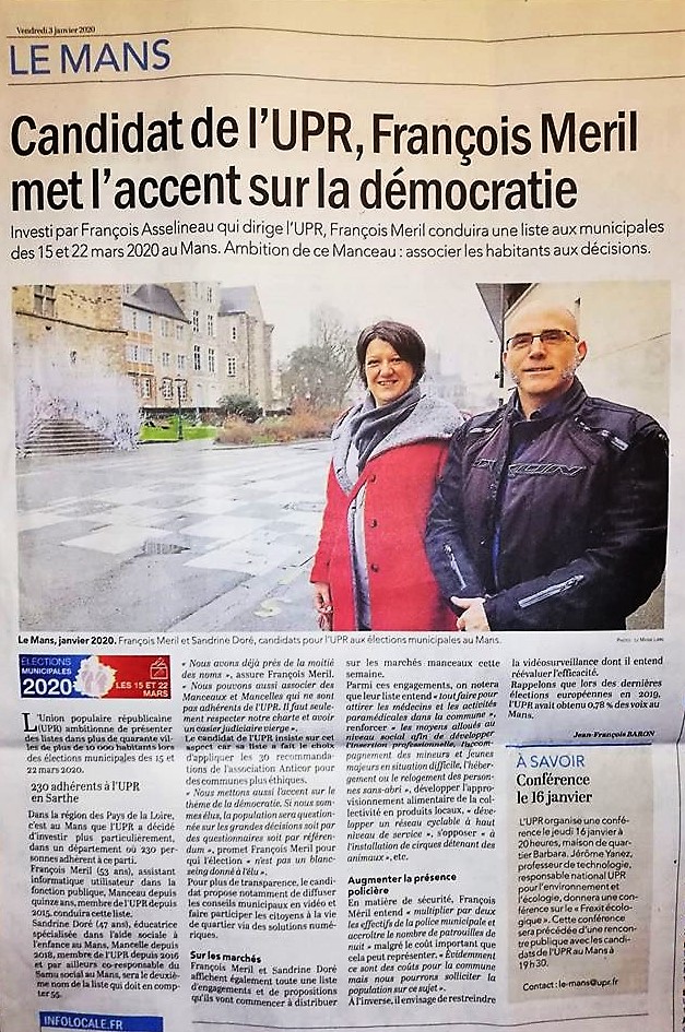 En signalant que l’UPR compte 230 adhérents dans la Sarthe, le journaliste du Maine libre dresse un portrait objectif de notre candidat à la mairie du Mans, François Meril, accompagné de Sandrine Doré (n° 2 de la liste).