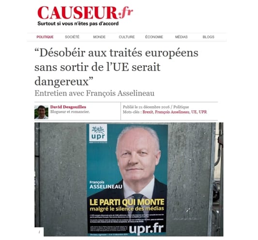 DÉSOBÉIR AUX TRAITÉS EUROPÉENS SANS SORTIR DE L'UE SERAIT DANGEREUX. François Asselineau répond à 3 questions de David Desgouilles, du blog « CAUSEUR »