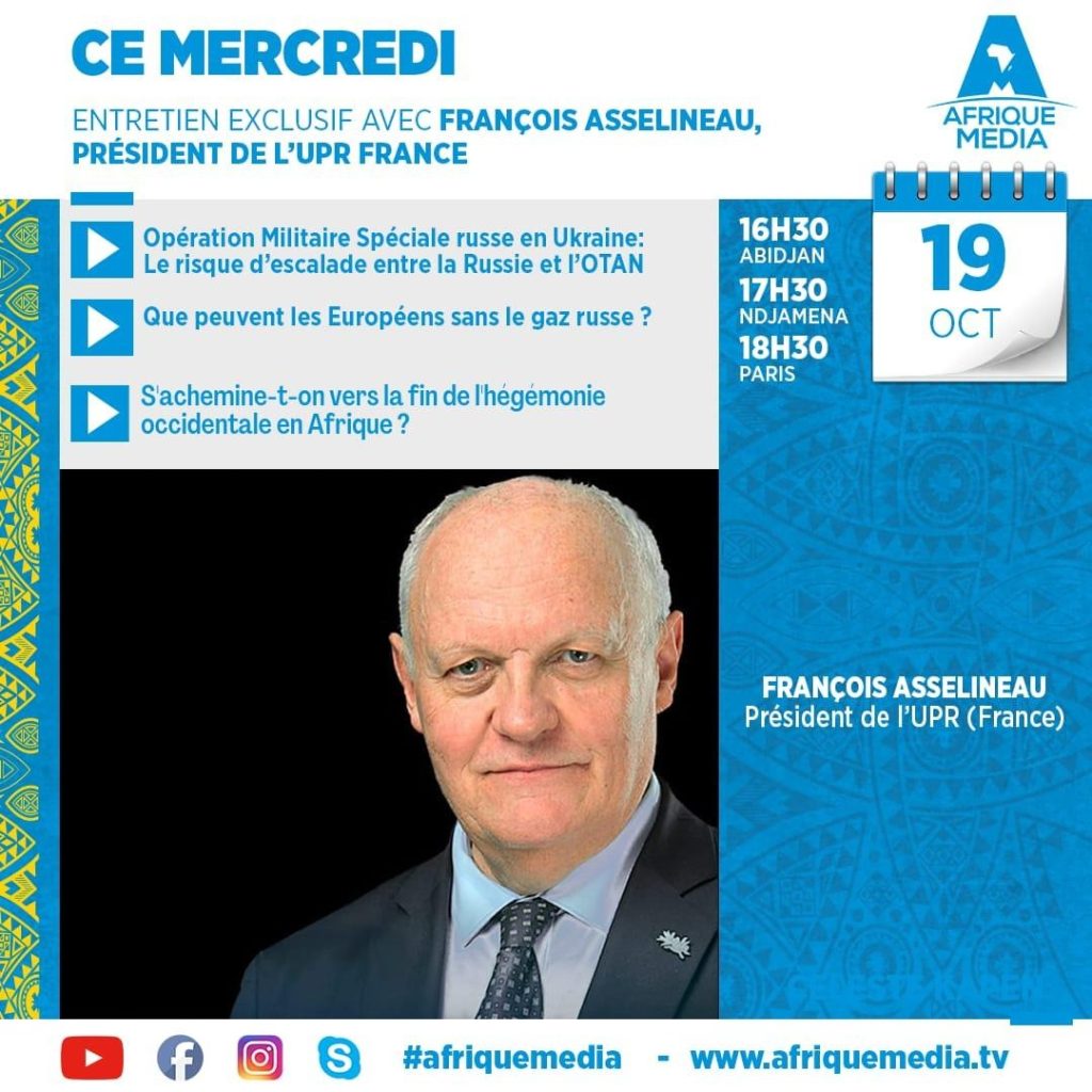 François Asselineau a répondu à un entretien exclusif – le mercredi 19 octobre 2022 – sur AFRIQUE MEDIA.