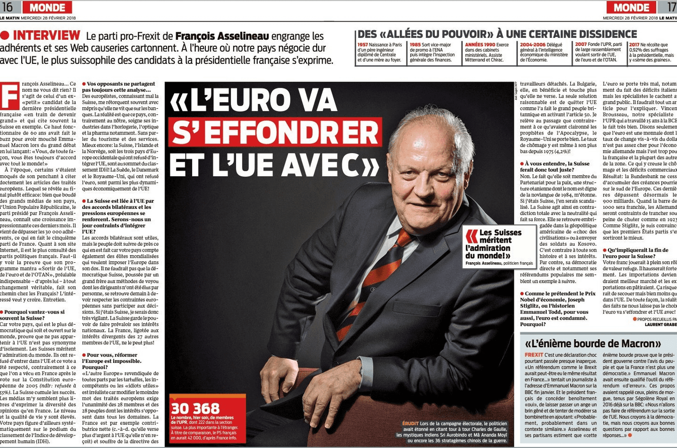 Ce 28 février 2018, le quotidien de Suisse romande « Le Matin » – qui est lu par plus de 270 000 personnes – a publié un entretien substantiel de François Asselineau sur 2 pages.