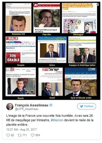 Retombée médiatique inattendue : le « Washington Post » du 25 août 2017 a repris mon tweet et mon photo-montage, en me citant expressément, au sujet des frais de maquillage de Macron qui font du président français « la risée de la planète entière ».
