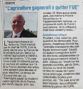 L’argument massue en faveur du Frexit martelé par le chef de l’UPR, c’est la perte sèche pour la France de 9 milliards par an. Selon lui, même l’agriculture a intérêt à sortir du système. « L’Europe nous coûte 23 milliards par an, et ne nous en restitue que 14. Si la France décidait des aides, elles seraient plus élevées et plus réactives. Le temps de l’Europe des six, où l’Allemagne payait la modernisation agricole de la France, est révolu depuis la fin des années 70. Mais aucun autre parti, pas même la France Insoumise ou le Rassemblement national ne proposent de sortir de l’Union européenne ; ils la critiquent mais tous veulent y rester… »