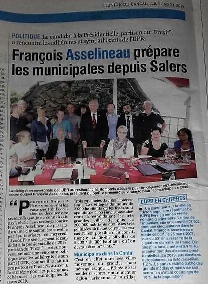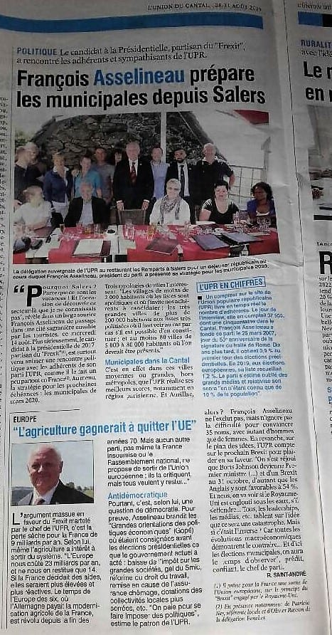 Le journal bi-hebdomadaire « L’Union du Cantal » a publié avec retard, dans son édition du 31 août 2019, une demi-page entière sur la venue de François Asselineau à Salers le 14 août 2019 (cf. aussi le reportage publié dans « La Montagne » du 16 août)