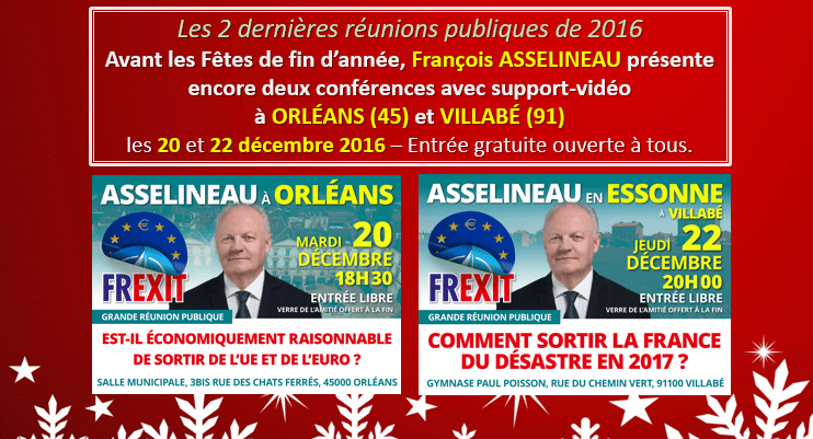 Avant les Fêtes de fin d’année, François ASSELINEAU présente encore deux conférences avec support-vidéo (Entrée gratuite ouverte à tous).