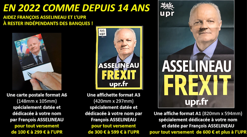- 1 carte format A6 pour tout versement de 100€ à 299€ à l’UPR
