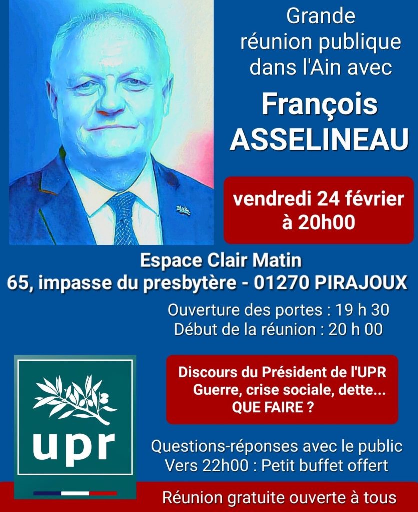 Grande réunion publique dans l’Ain avec François Asselineau ce vendredi 24 février à 20H00.