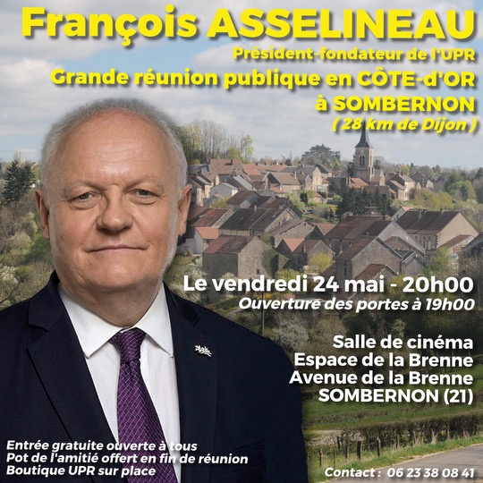 François Asselineau tiendra une réunion publique à Sombernon, à 28km de Dijon, en Côte-d’Or, le 24 mai 2024 : venez nombreux !