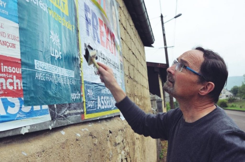 Sa journée de travail terminée, Didier Marandin ne rentre pas chez lui rejoindre sa femme et ses trois enfants. Aide-fromager dans une importante fruitière de la région, il fait son tour de collages d’affiches pour son parti, l’UPR, à raison de deux à trois fois par semaines depuis deux mois.