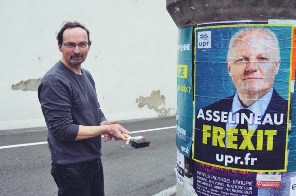 Encore un peu de colle sur les doigts, il poursuit : « Ils veulent qu’on soit uniquement des consommateurs. On n’a plus le droit à la parole. L’élection est juste là pour qu’on ait encore l’impression d’être en démocratie. Il faut que les choses changent, et rien ne changera tant qu’on restera dans les traités européens. « La République En Marche », c’est cela l’extrême-droite, ce n’est pas nous ! Nous, nous voulons que les gens puissent décider par eux-mêmes. L’Union européenne, c’est l’U.R.S.S. avant la chute du Mur. »