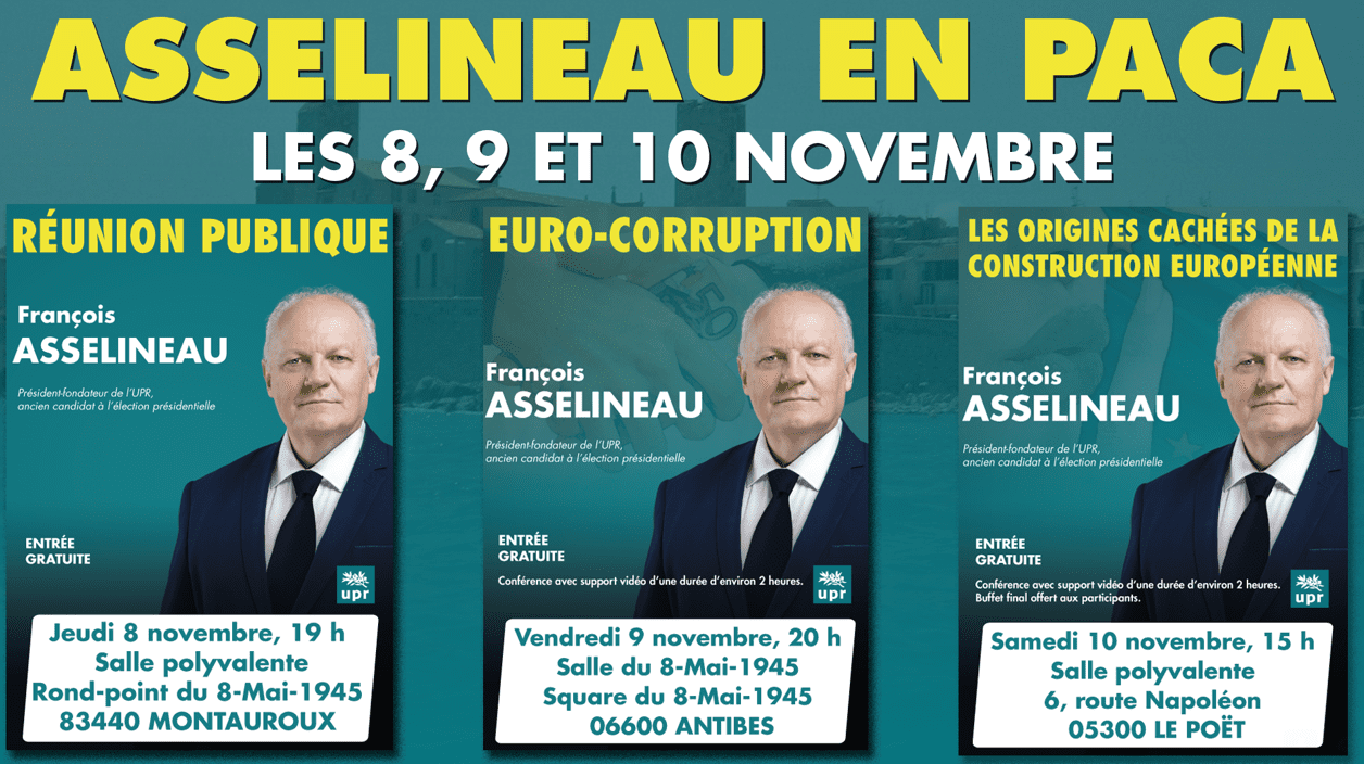 - Une conférence sur l’euro-corruption, qui est une grande première. Elle sera donnée vendredi 9 novembre à Antibes dans les Alpes-Maritimes, dans la salle du 8 mai 1945, à côté du square du même nom. Les portes ouvriront à 19h30 pour un début de conférence à 20h.