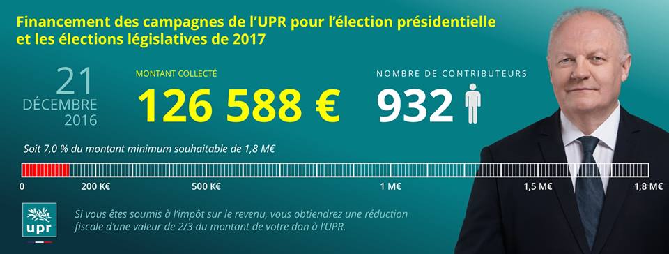 Le 12 décembre 2016 au soir, j’ai lancé un grand appel à adhésions, cotisations et dons afin de financer nos campagnes électorales pour l’élection présidentielle (si nous réussissons bien à réunir les 500 parrainages) et pour les élections législatives (cf. https://upr.fr/actualite/france/lupr-lance-grand-appel-a-adhesions-a-dons-afin-de-financer-campagnes-elections-presidentielle-legislatives )