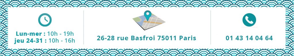 – soit directement dans notre boutique parisienne au 26-28 rue Basfroi 75011 Paris, où vous pourrez les obtenir sur le champ. Cette boutique sera ouverte pendant la période des fêtes du lundi au vendredi de 10h à 19h sauf jours fériés et sauf les 24 et 31 décembre où la boutique sera ouverte de 10h à 16h seulement.
