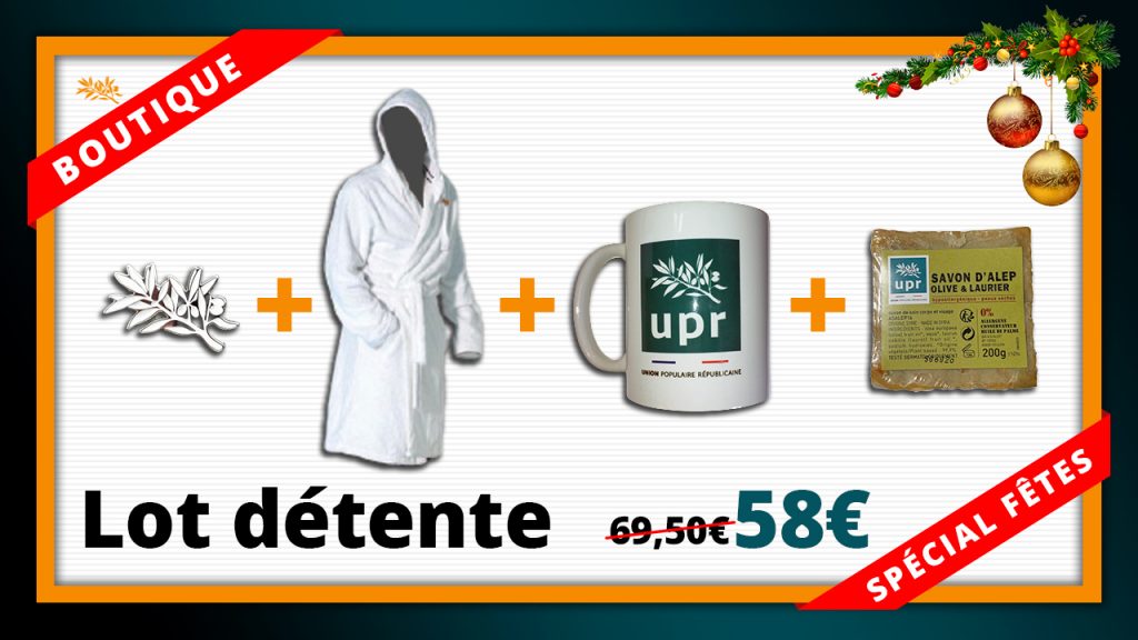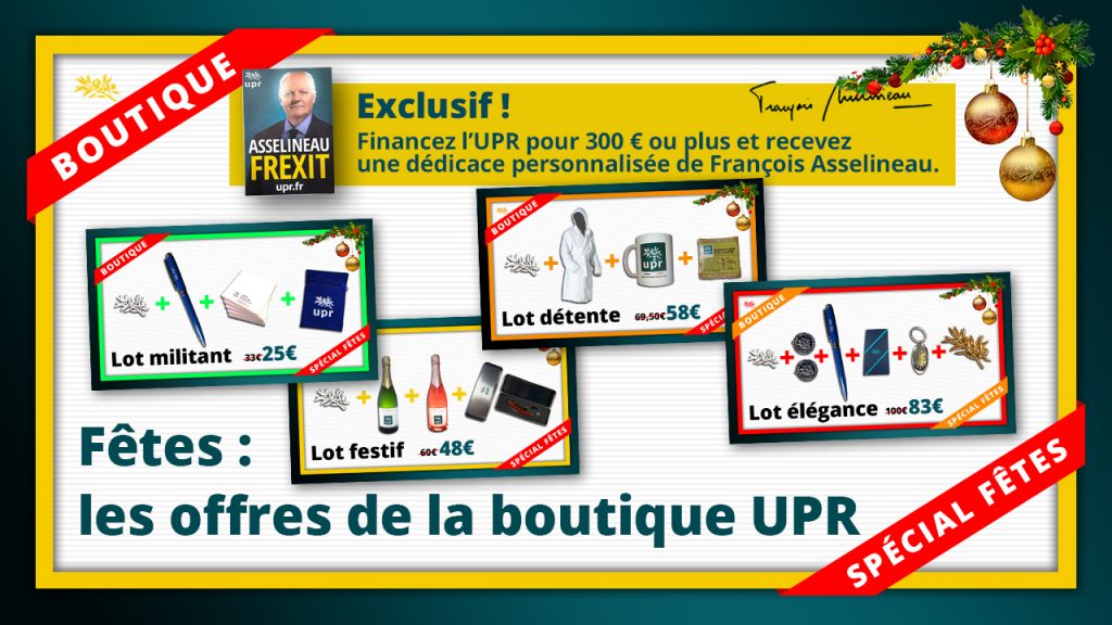 Vous souhaitez nous aider à développer nos analyses, UPRTV et notre combat politique ? Voici une solution qui mêlera l’utile à l’agréable. Pour les fêtes, la boutique UPR vous propose 4 lots exclusifs !