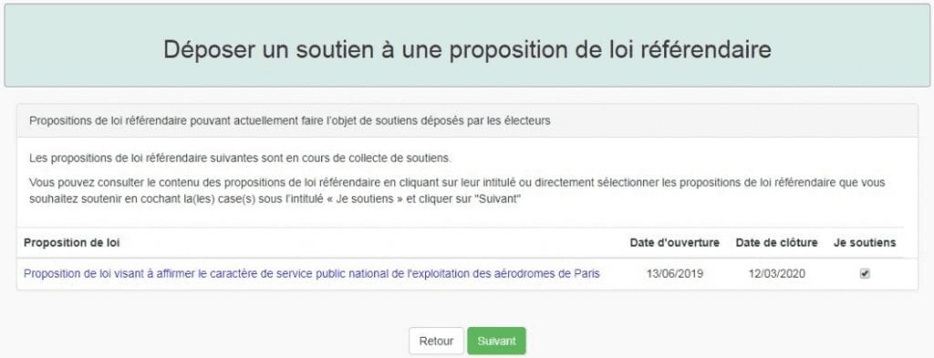 Ce 13 juin 2019, le ministère de l’Intérieur a ouvert sur son site la collecte des signatures nécessaires à l’organisation d’un « référendum d’initiative partagée » sur « la proposition de loi visant à affirmer le caractère de service public national de l’exploitation des aérodromes de Paris ».