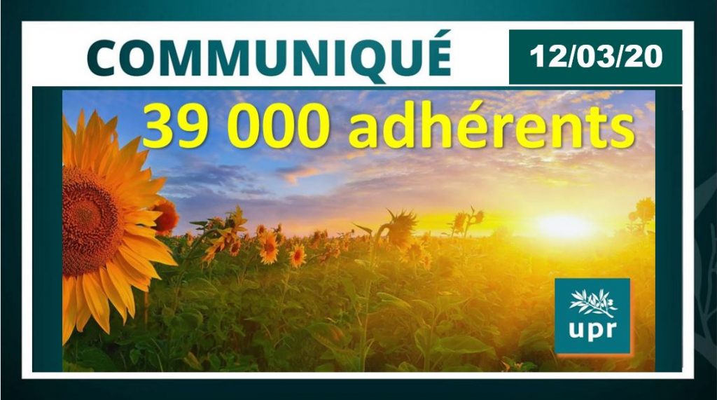 L’Union populaire républicaine (UPR), qui avait franchi le cap des 38 000 adhérents le 26 août 2019, vient de franchir celui des 39 000 adhérents ce 12 mars 2020 à 10h30, par une adhésion par Internet.