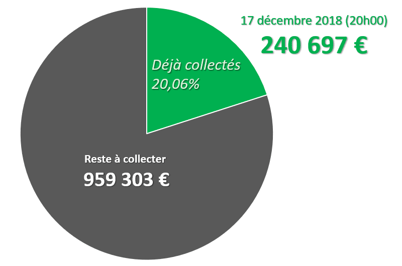 En ce 17 décembre 2018, cette collecte vient de dépasser les 20 % de la somme globale budgétée, que nous avons évaluée à 1 200 000 €.