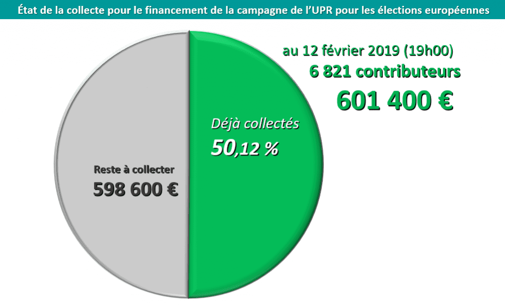 == 12 février 2019, 19h00 == Nous avons lancé, le 1er novembre dernier, une grande collecte pour le financement des élections européennes qui se tiendront le 26 mai 2019, au cours desquelles l’UPR présentera une liste nationale de 79 candidates et candidats.