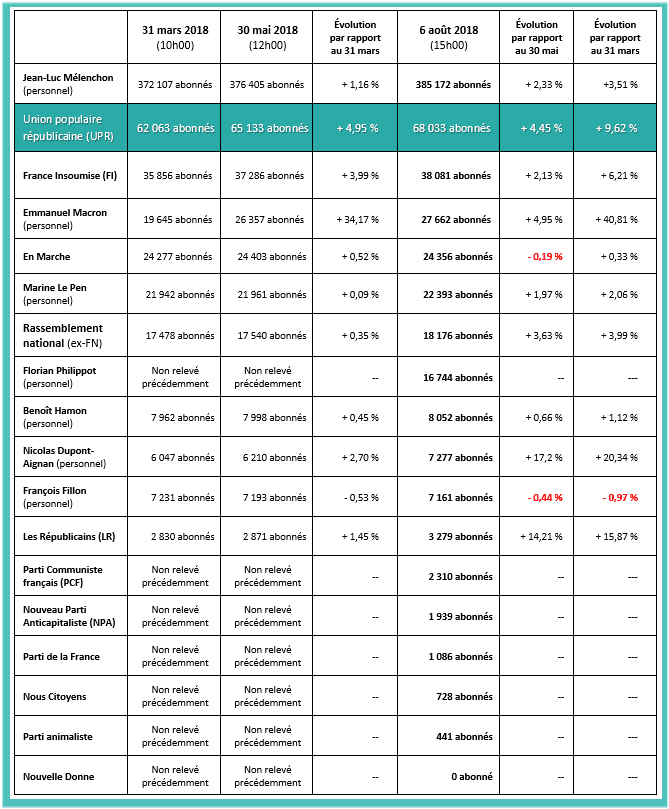 * La 6e colonne donne l’évolution du nombre d’abonnés entre le 31 mars 2018 et le 5 août (période de 128 jours).