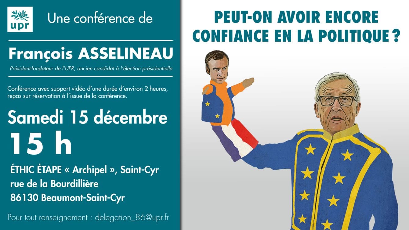 Entrée gratuite ouverte à tousPrécisions : https://upr.fr/evenement/conference-de-francois-asselineau-dans-la-vienne-a-beaumont-saint-cyr-86/?fbclid=IwAR2gttpMMyNpAKB0sa7bJ_4ACDoKBNhUnZOxYjqZ3nHBouzWpVy770P0Fz4