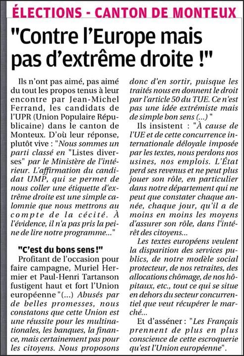 - La Provence avait publié, le 9 mars dernier, un long article sur le canton de Monteux dans lequel se présentent nos deux candidats Muriel Hermier et Paul-Henri Tartanson, dans lequel il mettait en exergue et en gras les déclarations diffamatoires du candidat UMP, J.M. Ferrand, qui affirmait crânement : « L’UPR va piquer des voix au FN et cette division de l’extrême-droite est bonne pour nous ». Et plus loin : « Le programme économique de l’UPR est exactement identique à celui du FN » [sic !, preuve que le candidat de l’UMP n’a jamais regardé ni lu notre programme ].