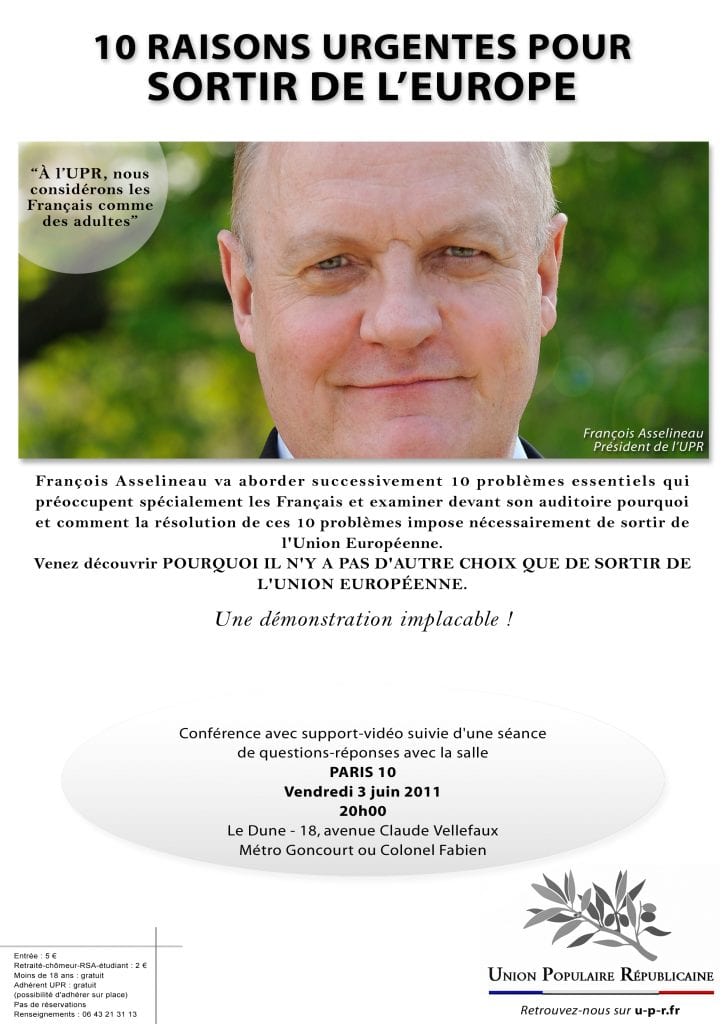 Le public (adhérents UPR, sympathisants, simples curieux) est convié à se joindre à ce dîner.