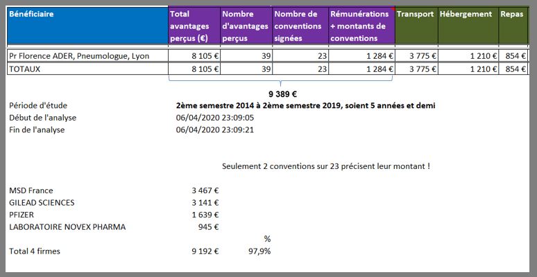 On y découvre que la Pr Ader a perçu pour 9 192 € d’avantages en provenance de 4 laboratoires pharmaceutiques sur la période allant du 2e semestre 2014 au 2e semestre 2019. Dont 3 141 € en provenance de GILEAD SCIENCES.