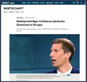 D’abord, le constat. Je le cite : « Depuis 2010, donc le début de la crise en zone euro, ce n’est plus le cas. L’excès d’épargne des Allemands est prêté au monde en dehors de la zone euro. » C’est ce qu’il dit, et je ne propose pas de mettre sa parole en doute. Il s’en émeut, faisant valoir que, d’une part, le rôle d’une union monétaire est censément de favoriser l’intégration financière entre ses membres, et que d’autre part cette source de financement, l’épargne allemande, est alors perdue pour la croissance du reste de la zone.