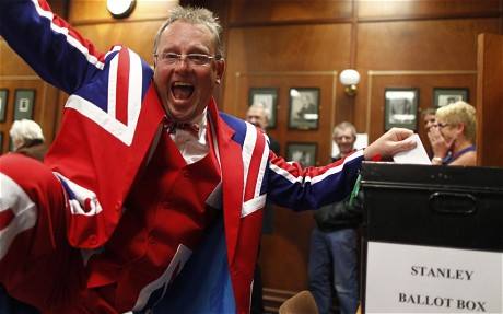 10 et 11 mars 2013 : les habitants des Falklands explosent de joie à l’annonce des résultats du référendum portant sur l’avenir de la souveraineté britannique sur l’archipel. Les « kelpers » ont choisi, avec le score sans appel de 99,8 %, de conserver le statut de territoire britannique d’outre-mer.