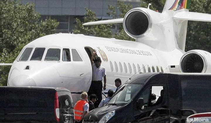 Cloué au sol contre sa volonté pendant 13 heures sur l’aéroport de Vienne (Autriche), le président bolivien sort un instant de son appareil pour prendre l’air et fait un signe à l’adresse des photographes de la presse mondiale.